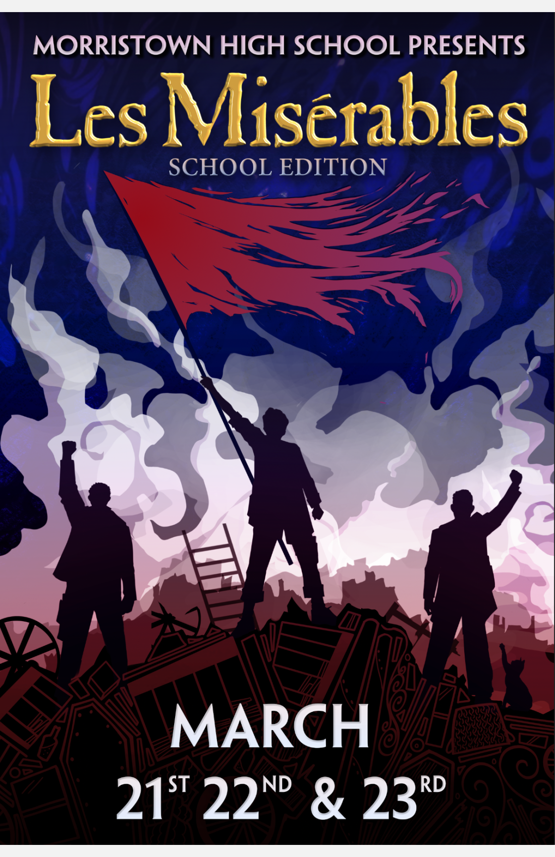 Celebrating 45 years since its Paris premiere and featuring one of the most memorable scores of all time, Victor Hugo's literary masterpiece, Les Misérables, will storm the stage at Morristown High School this March. Set against the backdrop of the 1832 June Rebellion, Les Misérables is a tale of broken dreams, perseverance, sacrifice, redemption, and love told through the eyes of Jean Valjean, a French peasant who is released from jail after 19 years for stealing a loaf of bread for his sister's starving child. Once released, Valjean finds nothing in store for him but mistrust and mistreatment. He breaks his parole in hopes of starting a new life, initiating a lifelong struggle for redemption as he is relentlessly pursued by police inspector Javert, who refuses to believe Valjean can change his ways. Will Valjean ultimately redeem himself? Will the will of the people of Paris prevail? Come join us on March, 21st, 22nd, and 23rd to find out!